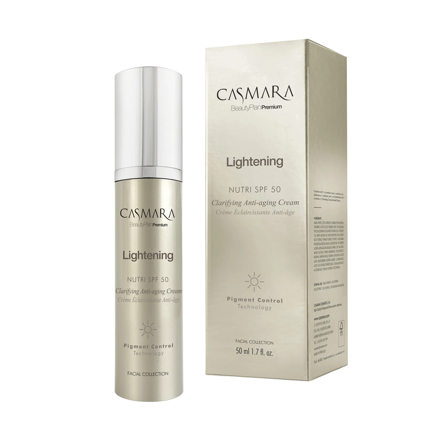 Crema antimanchas, despigmentante y antiedad. Crema facial aclarante iluminadora con SPF 50, que elimina o suaviza las manchas y evita su aparición; a la vez que combate de un modo global el fotoenvejecimiento y los signos de la edad de un modo tratante y preventivo. Aporta un halo de perfección al rostro desde la primera aplicación.